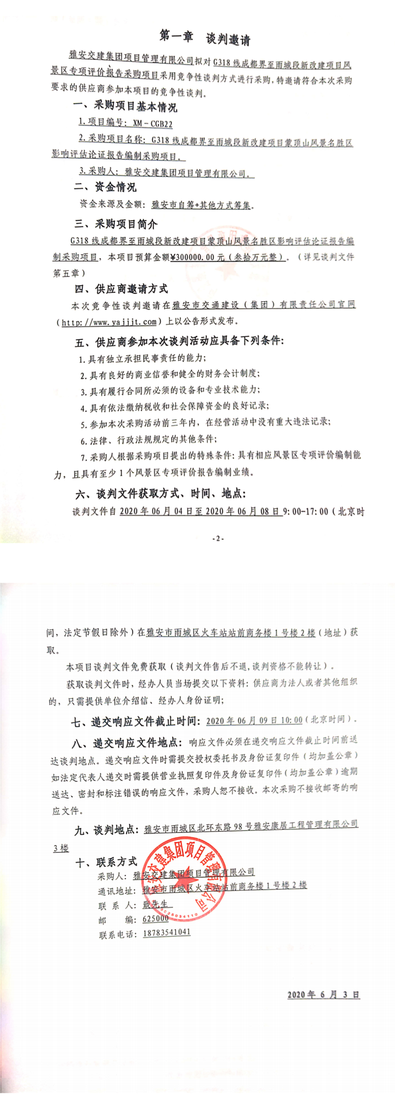 雅安交建集團(tuán)項(xiàng)目管理有限公司G318線成都界至雨城段新改建項(xiàng)目蒙頂山風(fēng)景名勝區(qū)影響評(píng)估論證報(bào)告編制采購(gòu)項(xiàng)目競(jìng)爭(zhēng)性談判公告