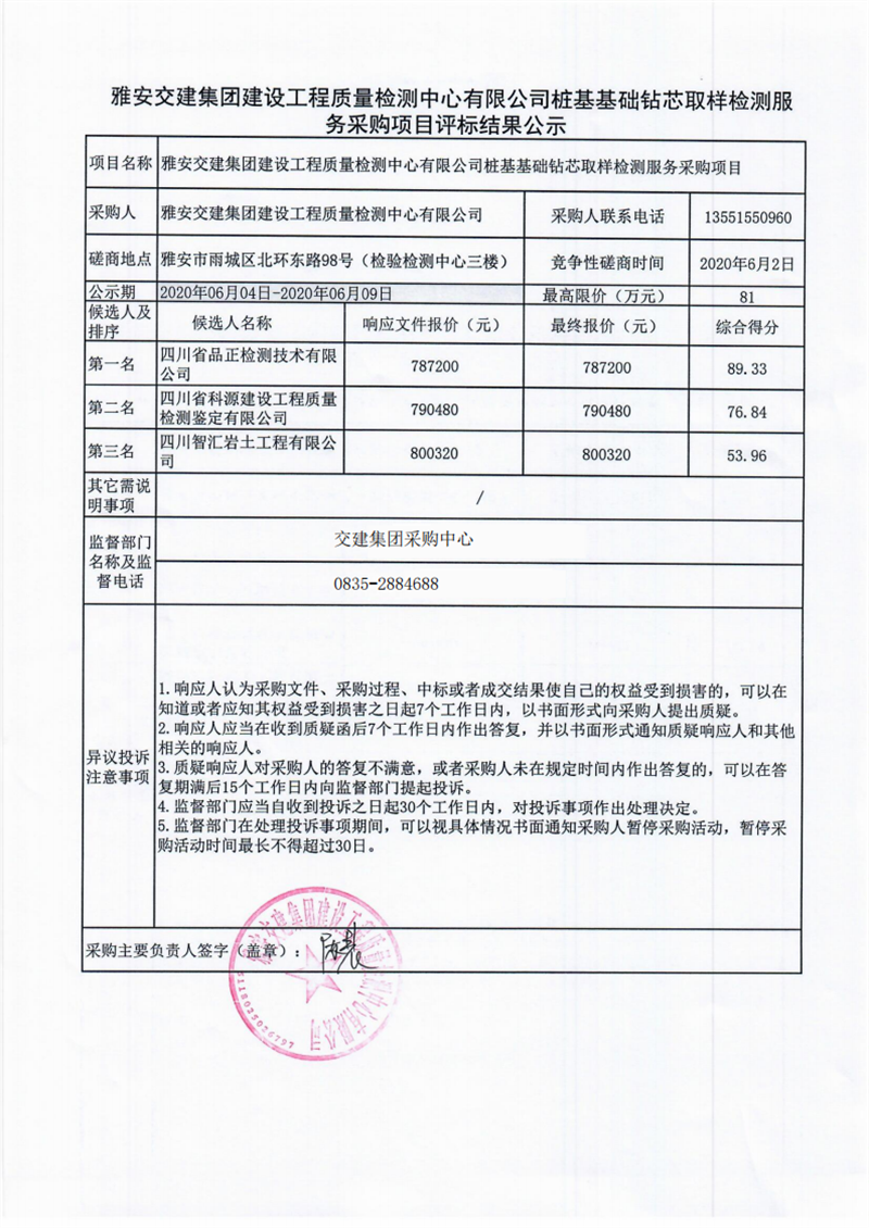 雅安交建集團(tuán)建設(shè)工程質(zhì)量檢測(cè)中心有限公司樁基基礎(chǔ)鉆芯取樣檢測(cè)服務(wù)采購(gòu)項(xiàng)目評(píng)標(biāo)結(jié)果公示