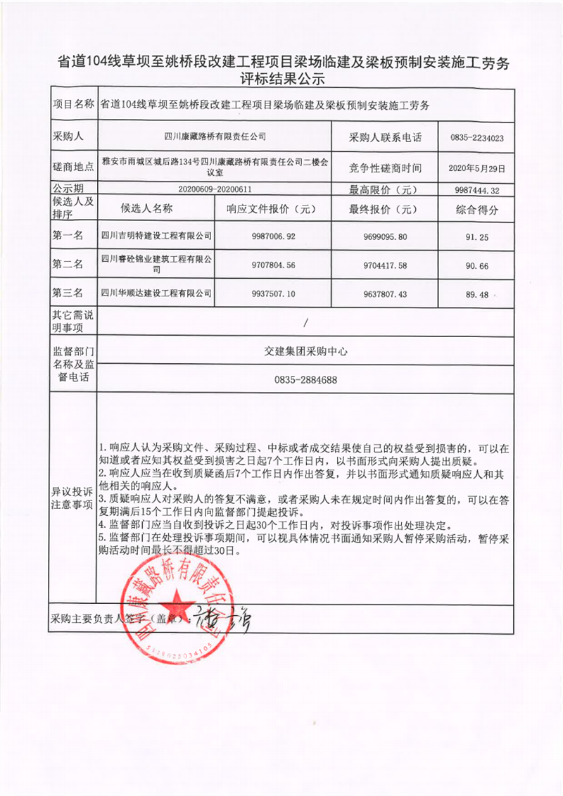 四川康藏路橋有限責(zé)任公司省道104線草壩至姚橋段改建工程項(xiàng)目梁場臨建及梁板預(yù)制安裝施工勞務(wù)評(píng)標(biāo)結(jié)果公示