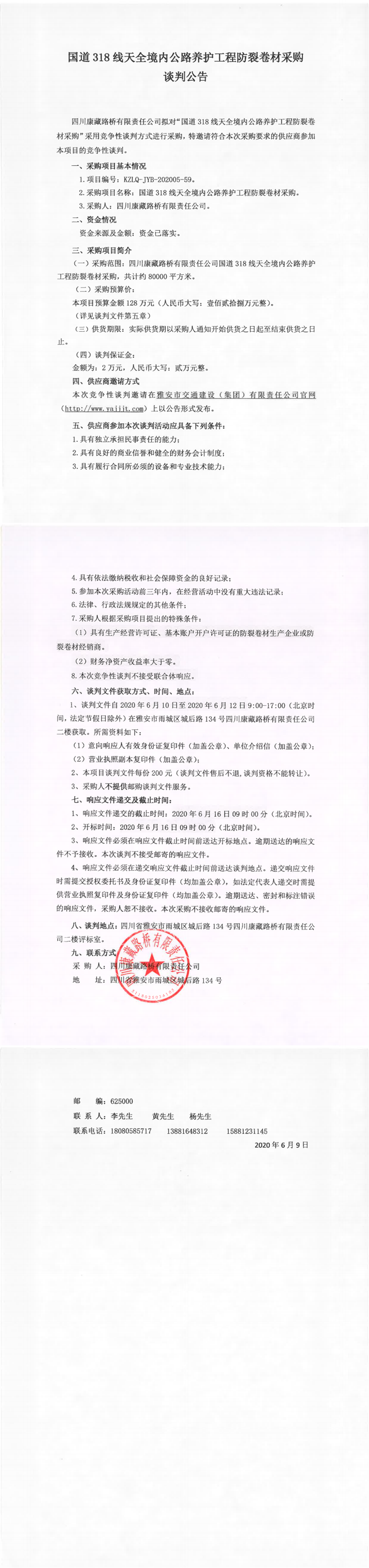 四川康藏路橋有限責(zé)任公司國(guó)道318線天全境內(nèi)公路養(yǎng)護(hù)工程防裂卷材采購競(jìng)爭(zhēng)性談判公告