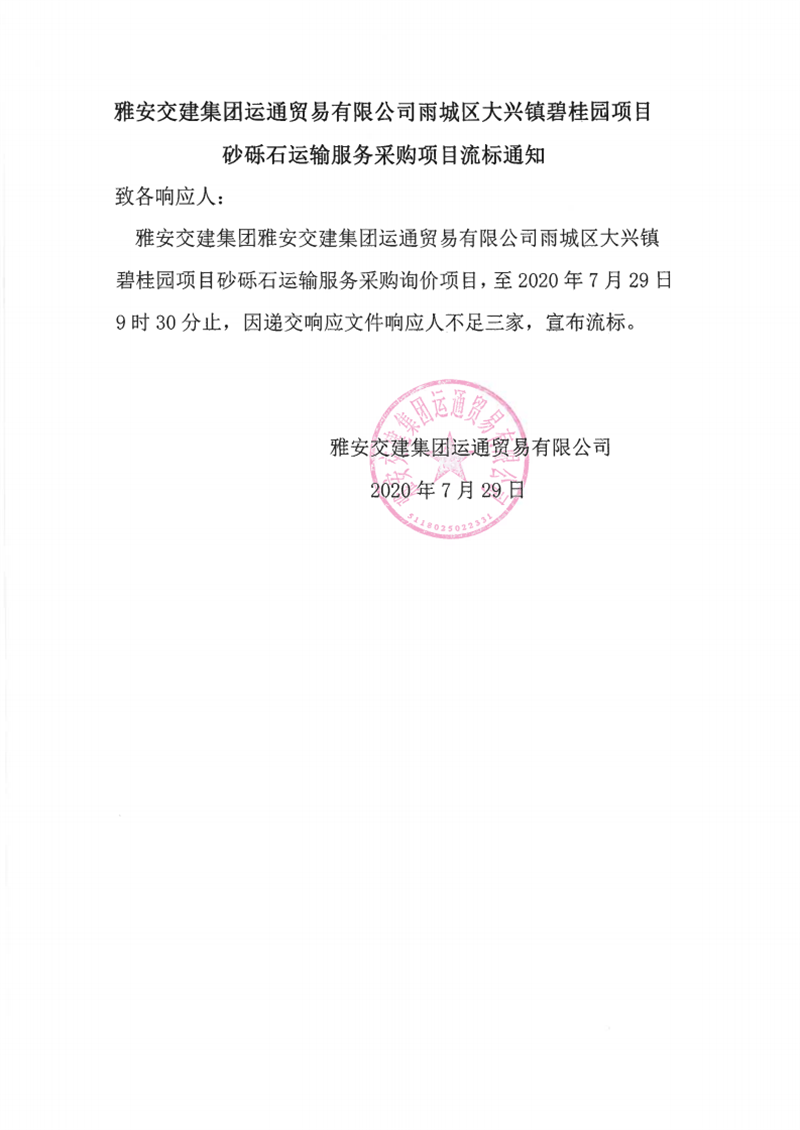 雅安交建集團(tuán)運(yùn)通貿(mào)易有限公司雨城區(qū)大興鎮(zhèn)碧桂園砂礫石運(yùn)輸服務(wù)采購(gòu)項(xiàng)目流標(biāo)通知