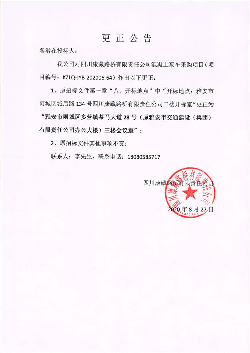 四川康藏路橋有限責(zé)任公司混凝土泵車采購項(xiàng)目更正公告