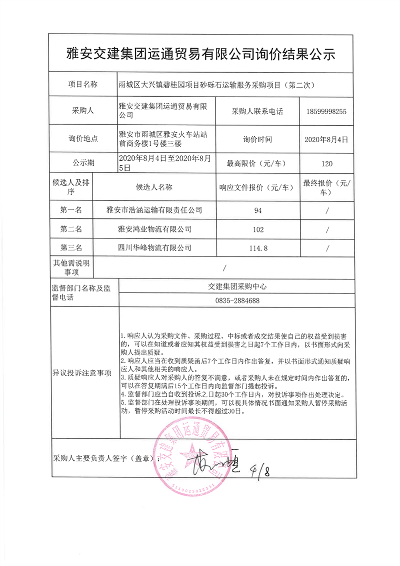 雅安交建集團(tuán)運(yùn)通貿(mào)易有限公司雨城區(qū)大興鎮(zhèn)碧桂園項(xiàng)目砂礫石運(yùn)輸服務(wù)采購項(xiàng)目(第二次)詢價結(jié)果公示