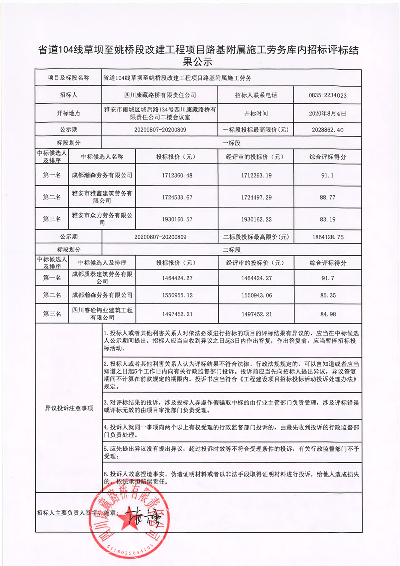 四川康藏路橋有限責(zé)任公司省道104線草壩至姚橋段改建工程項(xiàng)目路基附屬施工勞務(wù)庫(kù)內(nèi)招標(biāo)評(píng)標(biāo)結(jié)果公示