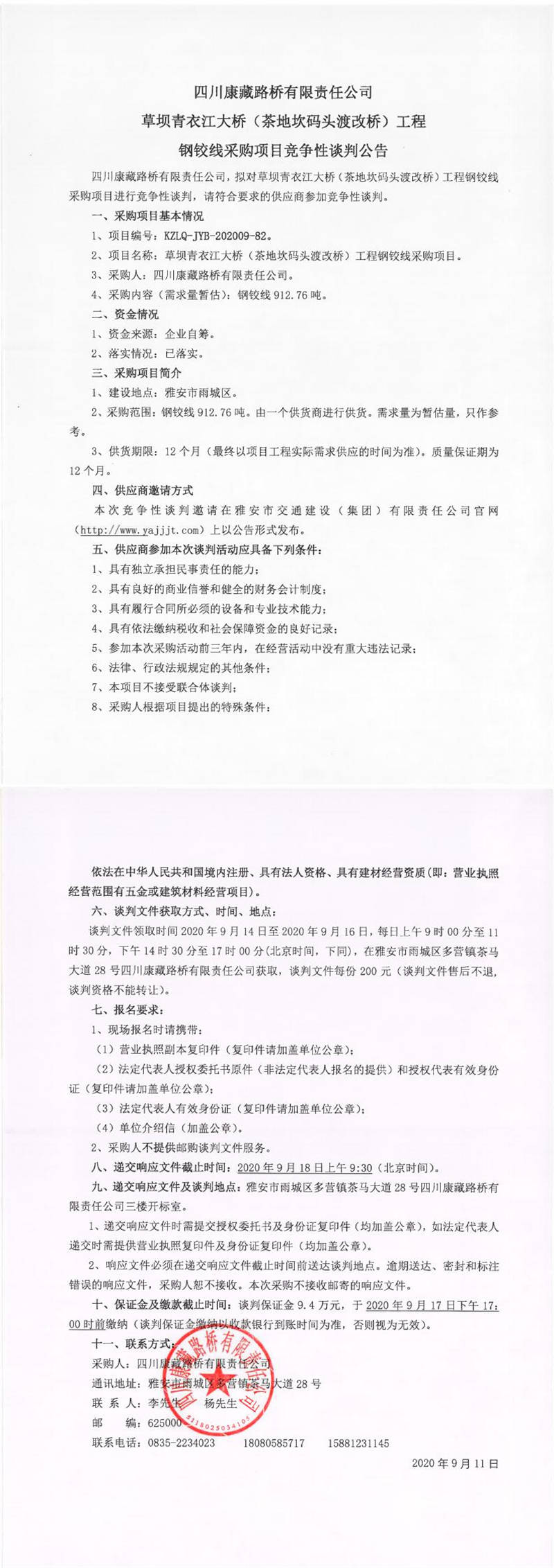 四川康藏路橋有限責(zé)任公司草壩青衣江大橋(茶地坎碼頭渡改橋)工程鋼鉸線采購(gòu)項(xiàng)目競(jìng)爭(zhēng)性談判公告
