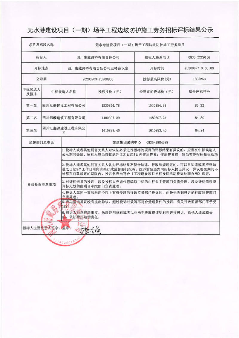 四川康藏路橋有限責任公司無水港建設項目(一期)場平工程邊坡防護施工勞務招標評標結(jié)果公示