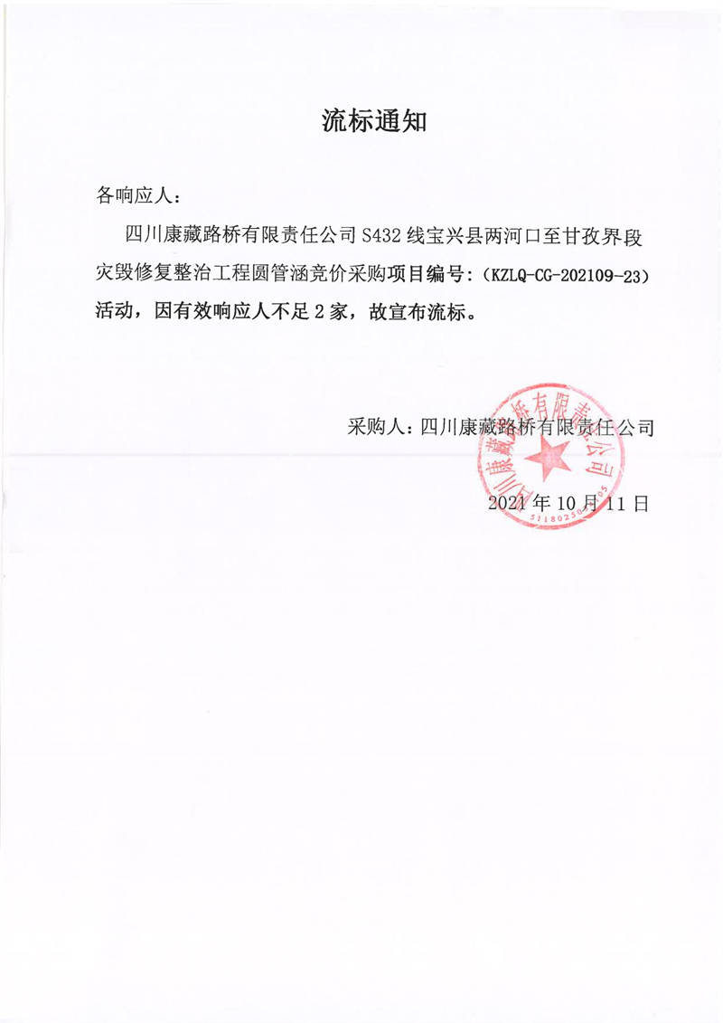 四川康藏路橋有限責(zé)任公司S432線寶興縣兩河口至甘孜界段災(zāi)毀修復(fù)整治工程圓管涵采購競價流標(biāo)通知