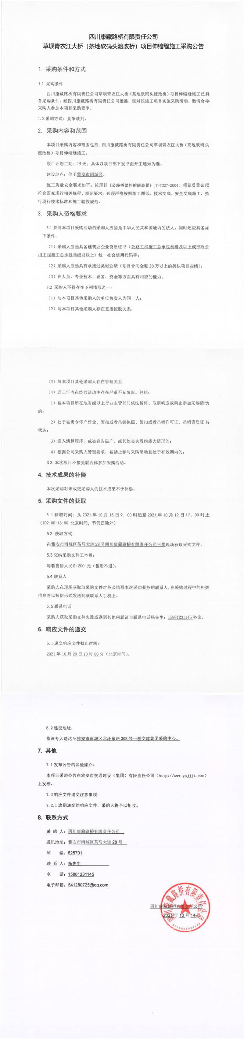 四川康藏路橋有限責任公司草壩青衣江大橋(茶地坎碼頭渡改橋)項目伸縮縫施工采購公告