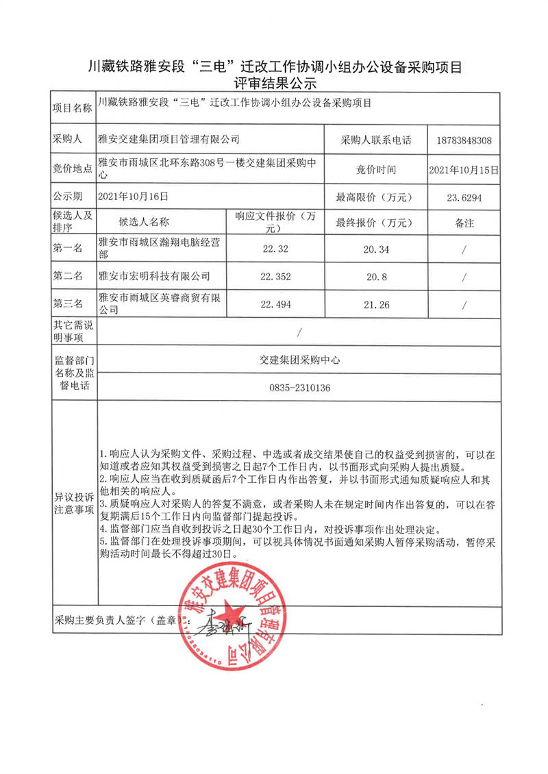 雅安交建集團(tuán)項目管理有限公司川藏鐵路雅安段“三電”遷改工作協(xié)調(diào)小組辦公設(shè)備采購項目評審結(jié)果公示