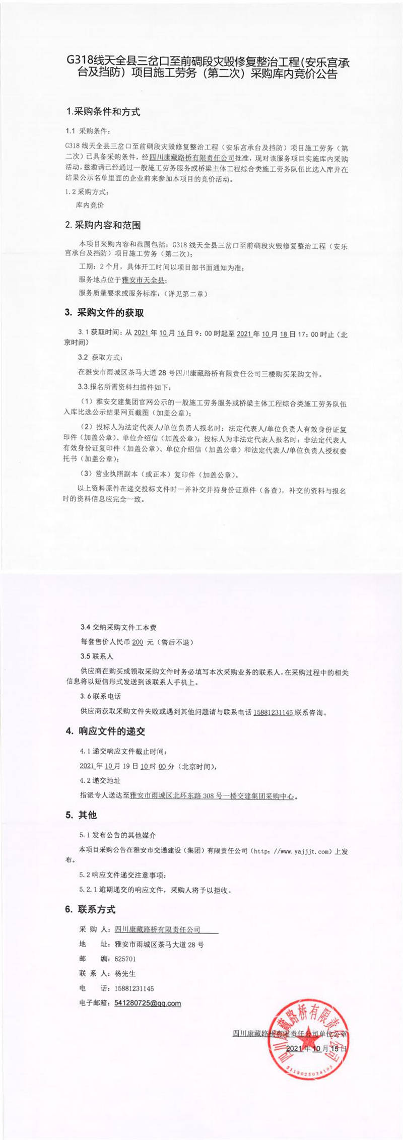 四川康藏路橋有限責(zé)任公司G318線天全縣三岔口至前碉段災(zāi)毀修復(fù)整治工程(安樂宮承臺及擋防)項(xiàng)目施工勞務(wù)(第二次)采購庫內(nèi)競價(jià)公告