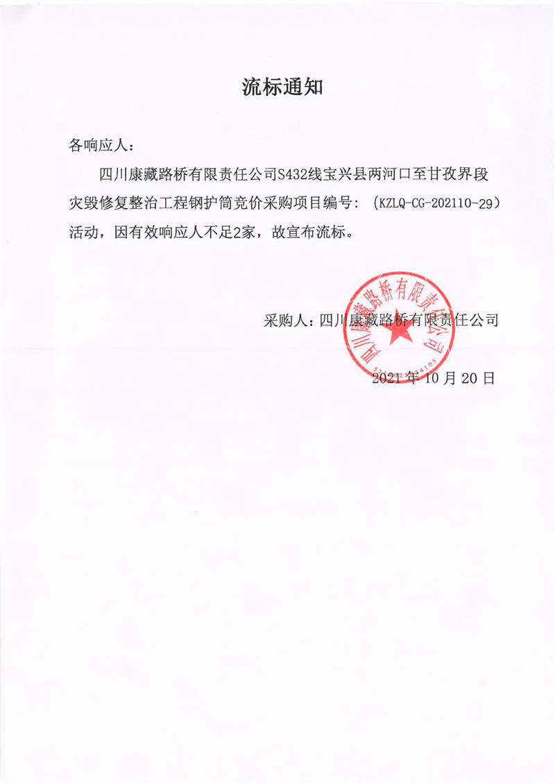四川康藏路橋有限責(zé)任公司S432線(xiàn)寶興縣兩河口至甘孜界段災(zāi)毀修復(fù)整治工程鋼護(hù)筒競(jìng)價(jià)采購(gòu)流標(biāo)通知