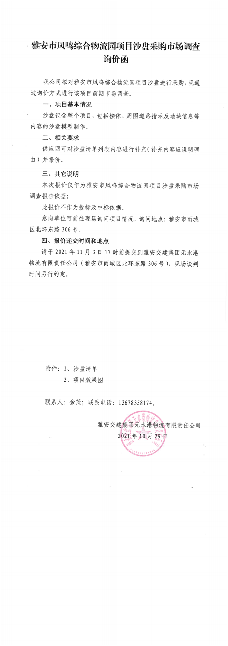 雅安交建集團(tuán)無(wú)水港物流有限責(zé)任公司雅安市鳳鳴綜合物流園項(xiàng)目沙盤采購(gòu)市場(chǎng)調(diào)查詢價(jià)函
