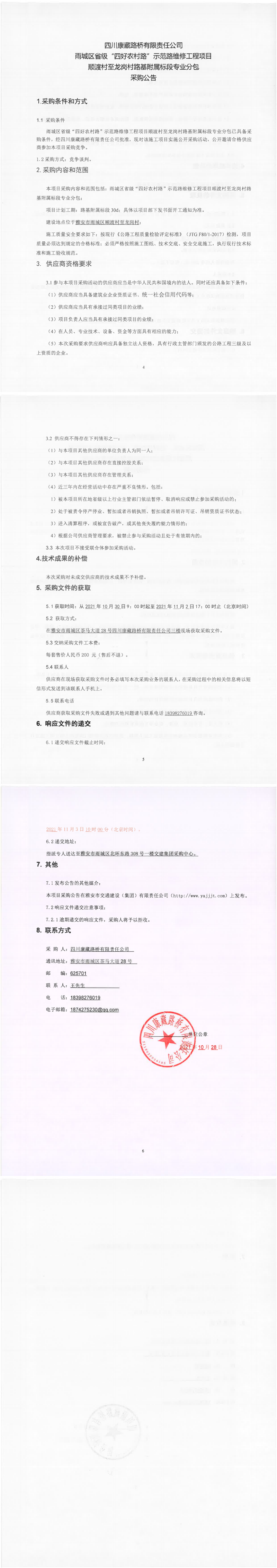 四川康藏路橋有限責(zé)任公司雨城區(qū)省級(jí)“四好農(nóng)村路”示范路維修工程項(xiàng)目順渡村至龍崗村路基附屬標(biāo)段專業(yè)分包采購公告