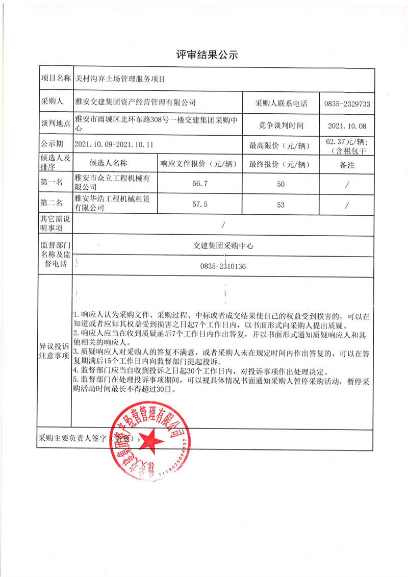 雅安交建集團資產(chǎn)經(jīng)營管理有限公司關(guān)材溝棄土場管理服務(wù)項目評審結(jié)果公示
