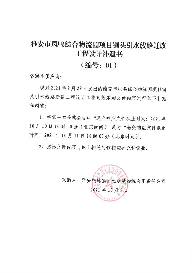 雅安交建集團(tuán)無水港物流有限責(zé)任公司雅安市鳳鳴綜合物流園項(xiàng)目銅頭引水線路遷改工程設(shè)計(jì)補(bǔ)遺書