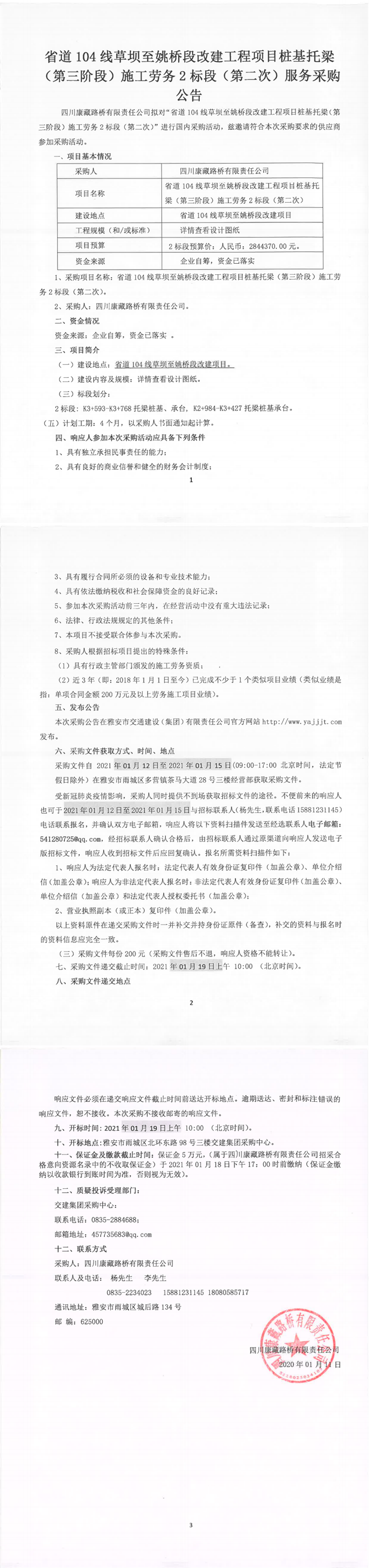 四川康藏路橋有限公司省道104線草壩至姚橋段改建工程項目樁基托梁(第三階段)施工勞務(wù)2標段(第二次)服務(wù)采購公告