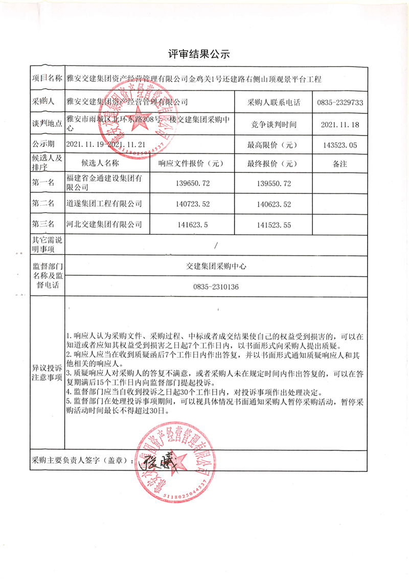雅安交建集團(tuán)資產(chǎn)經(jīng)營(yíng)管理有限公司金雞關(guān)1號(hào)還建路右側(cè)山頂觀景平臺(tái)工程評(píng)審結(jié)果公示