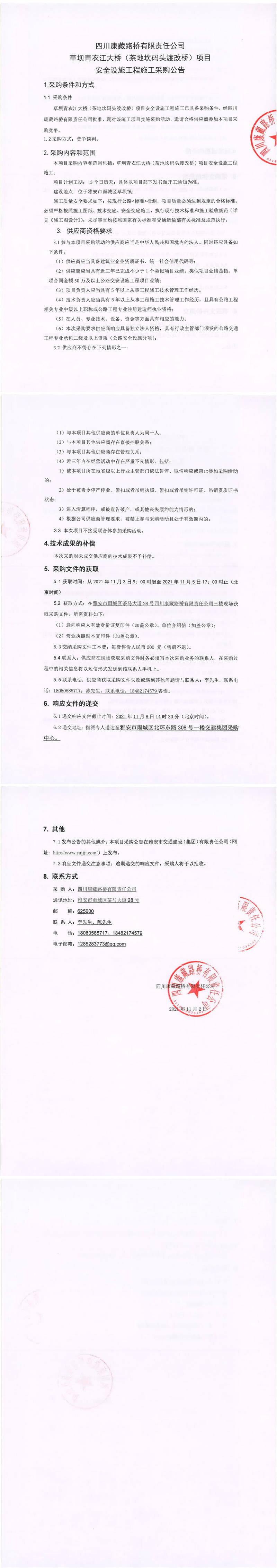 四川康藏路橋有限責任公司草壩青衣江大橋(茶地坎碼頭渡改橋)項目安全設(shè)施工程施工采購公告