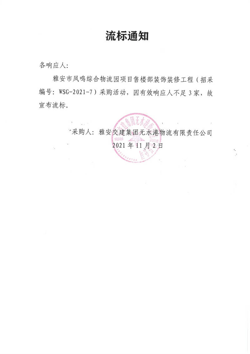 雅安交建集團無水港物流有限責任公司雅安市鳳鳴綜合物流園項目售樓部裝飾裝修工程采購流標通知