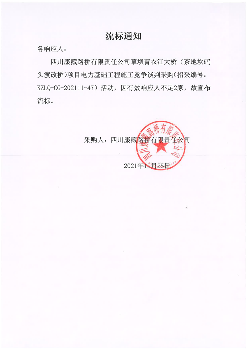 四川康藏路橋有限責(zé)任公司草壩青衣江大橋(茶地坎碼頭渡改橋)項(xiàng)目電力基礎(chǔ)工程施工競(jìng)爭(zhēng)談判采購(gòu)流標(biāo)通知