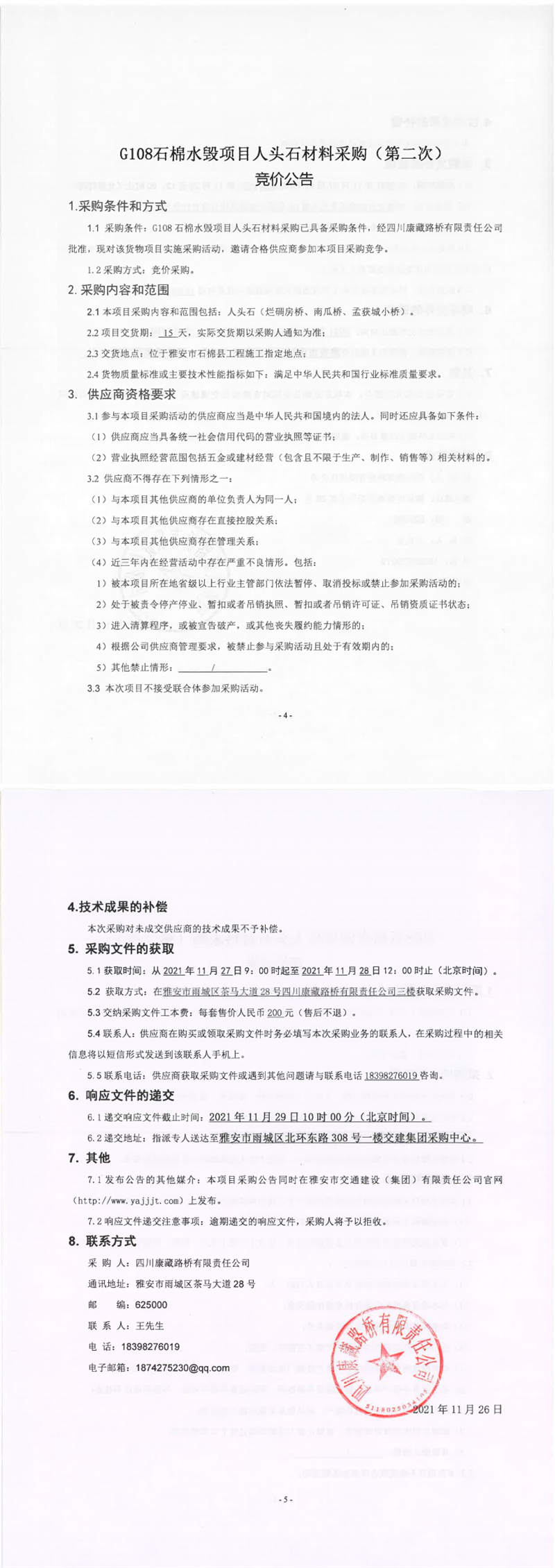 四川康藏路橋有限責(zé)任公司G108石棉水毀項目人頭石材料采購(第二次)競價公告