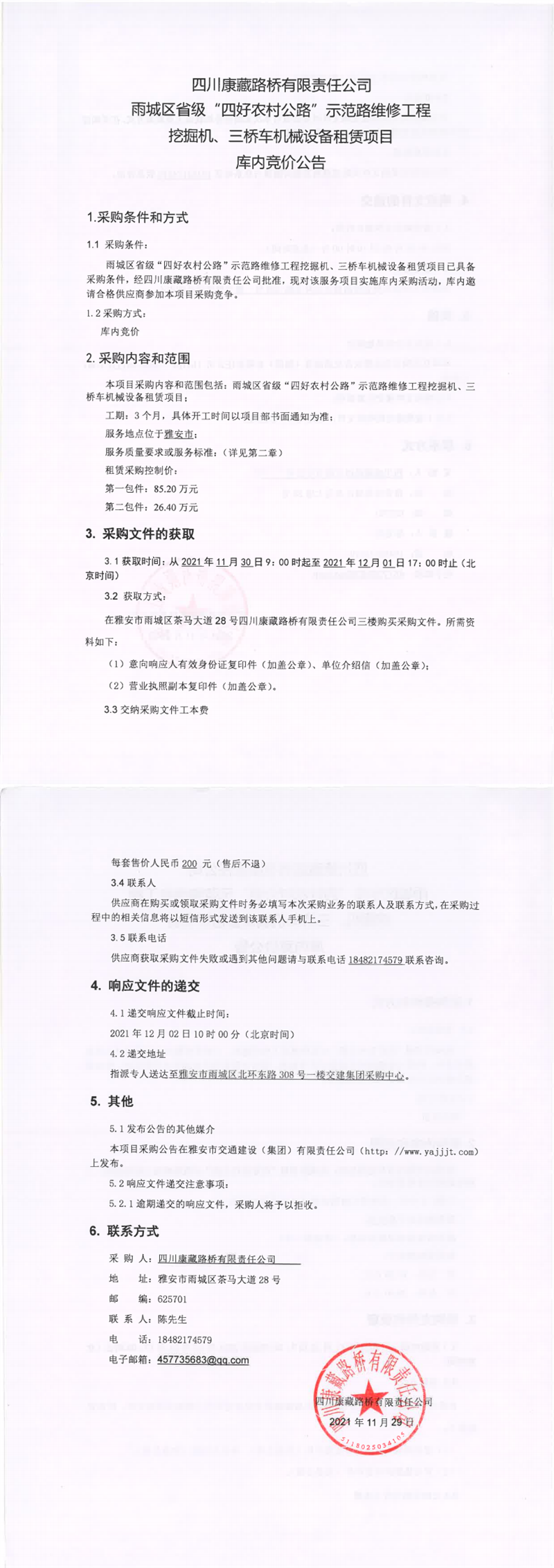四川康藏路橋有限責任公司雨城區(qū)省級“四好農(nóng)村公路”示范路維修工程挖掘機、三橋車機械設備租賃項目庫內(nèi)競價公告