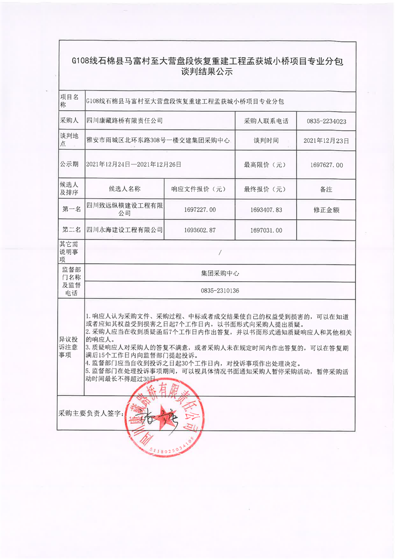 四川康藏路橋有限責(zé)任公司G108線石棉縣馬富村至大營盤段恢復(fù)重建工程孟獲城小橋項(xiàng)目專業(yè)分包談判結(jié)果公示