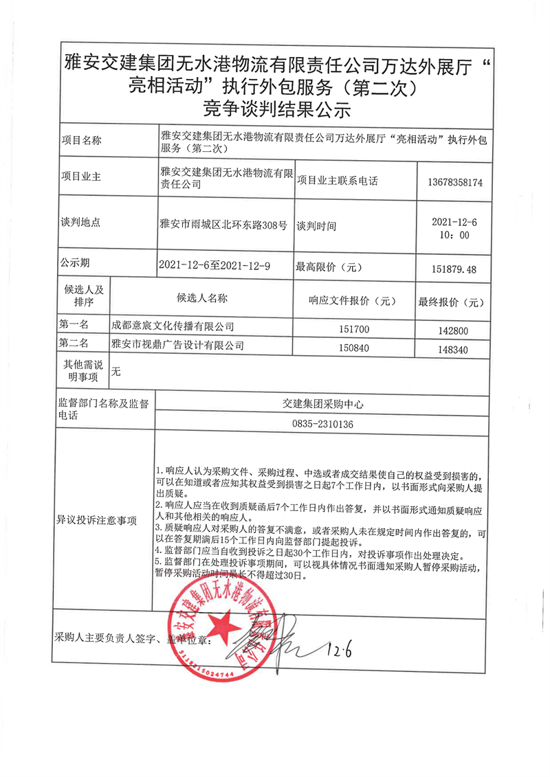 雅安交建集團(tuán)無水港物流有限責(zé)任公司萬達(dá)外展廳“亮相活動(dòng)”執(zhí)行外包服務(wù)(第二次)競爭談判結(jié)果公示