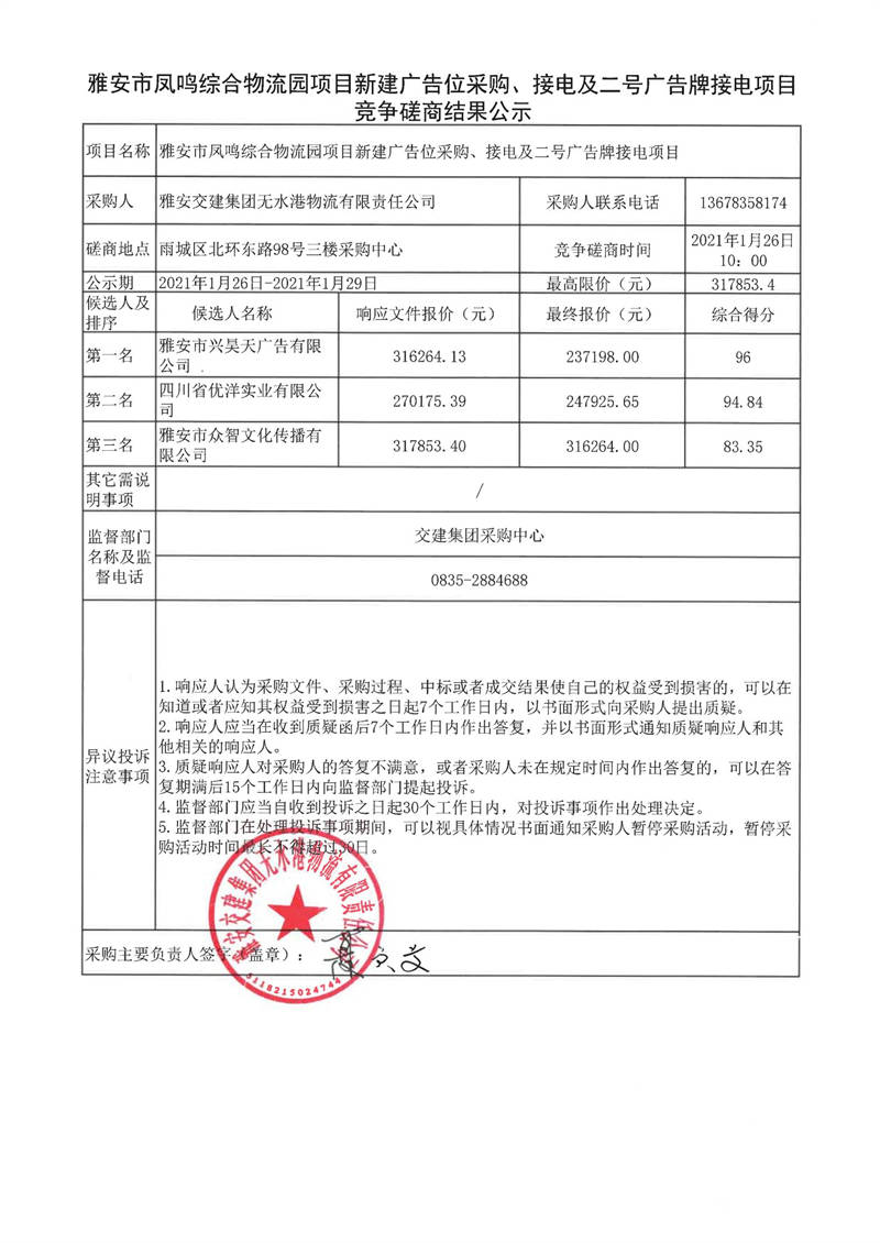 雅安交建集團(tuán)無水港物流有限責(zé)任公司雅安市鳳鳴綜合物流園項(xiàng)目新建廣告位采購、接電及二號廣告牌接電項(xiàng)目競爭磋商結(jié)果公示