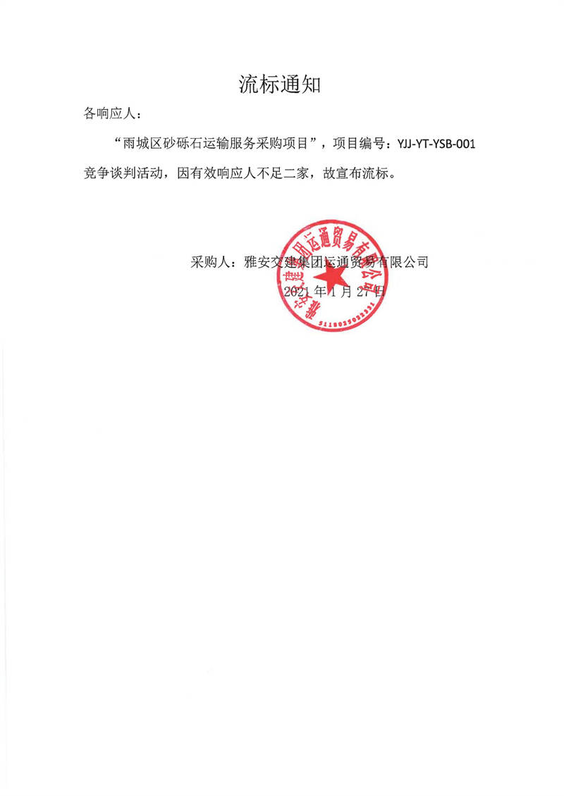 雅安交建集團(tuán)運(yùn)通貿(mào)易有限公司雨城區(qū)砂礫石運(yùn)輸服務(wù)采購項(xiàng)目流標(biāo)通知