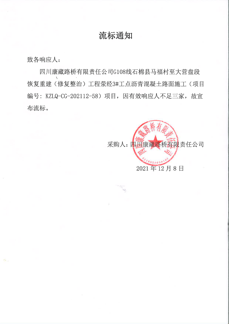 四川康藏路橋有限責任公司G108線石棉縣馬福村至大營盤段恢復重建(修復整治)工程滎經(jīng)3#工點瀝青混凝土路面施工流標通知