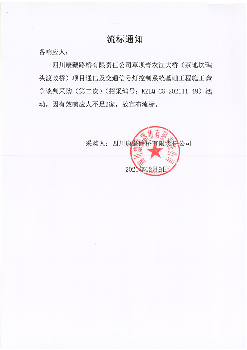 四川康藏路橋有限責任公司草壩青衣江大橋(茶地坎碼頭渡改橋)項目通信及交通信號燈控制系統(tǒng)基礎(chǔ)工程施工競爭談判采購(第二次)流標通知