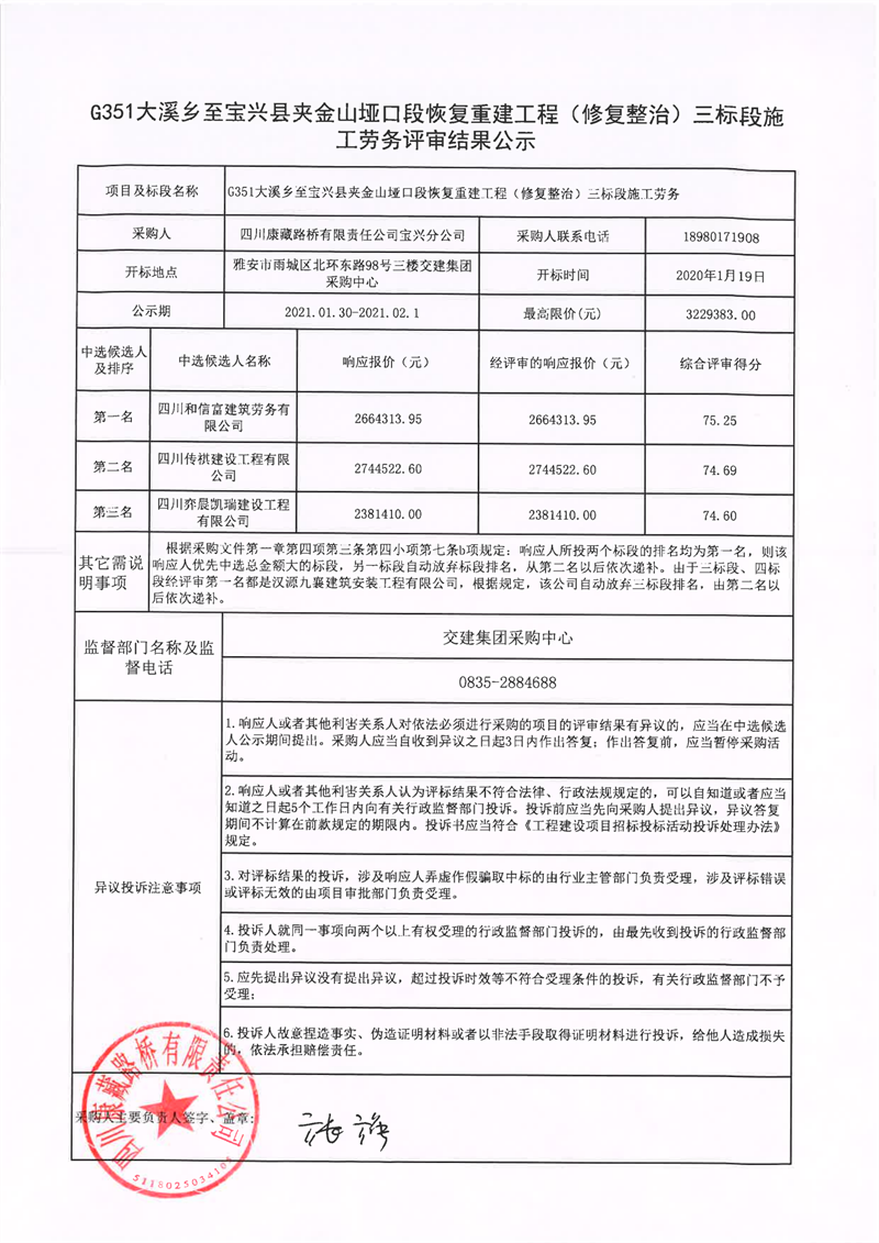 四川康藏路橋有限責任公司G351大溪鄉(xiāng)至寶興縣夾金山埡口段恢復重建工程(修復整治)三標段施工勞務評審結(jié)果公示