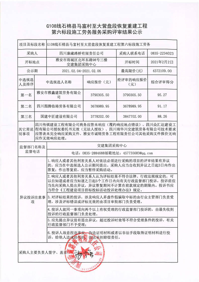 四川康藏路橋有限責任公司G108線石棉縣馬富村至大營盤段恢復(fù)重建工程第六標段施工勞務(wù)服務(wù)采購評審結(jié)果公示