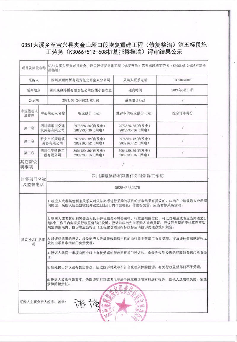 四川康藏路橋有限責(zé)任公司寶興分公司G351大溪鄉(xiāng)至寶興縣夾金山埡口段恢復(fù)重建工程(修復(fù)整治)第五標(biāo)段施工勞務(wù)(k3066+512-608樁基托梁擋墻)評審結(jié)果公示