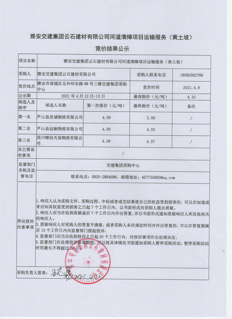 雅安交建集團云石建材有限公司河道清障項目運輸服務(wù)競價結(jié)果公示