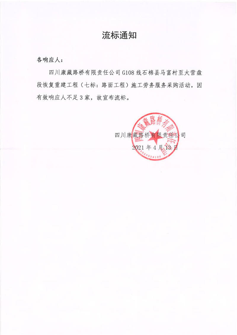 四川康藏路橋有限責(zé)任公司G108線石棉縣馬富村至大營盤段恢復(fù)重建工程(七標(biāo):路面工程)施工勞務(wù)服務(wù)流標(biāo)通知