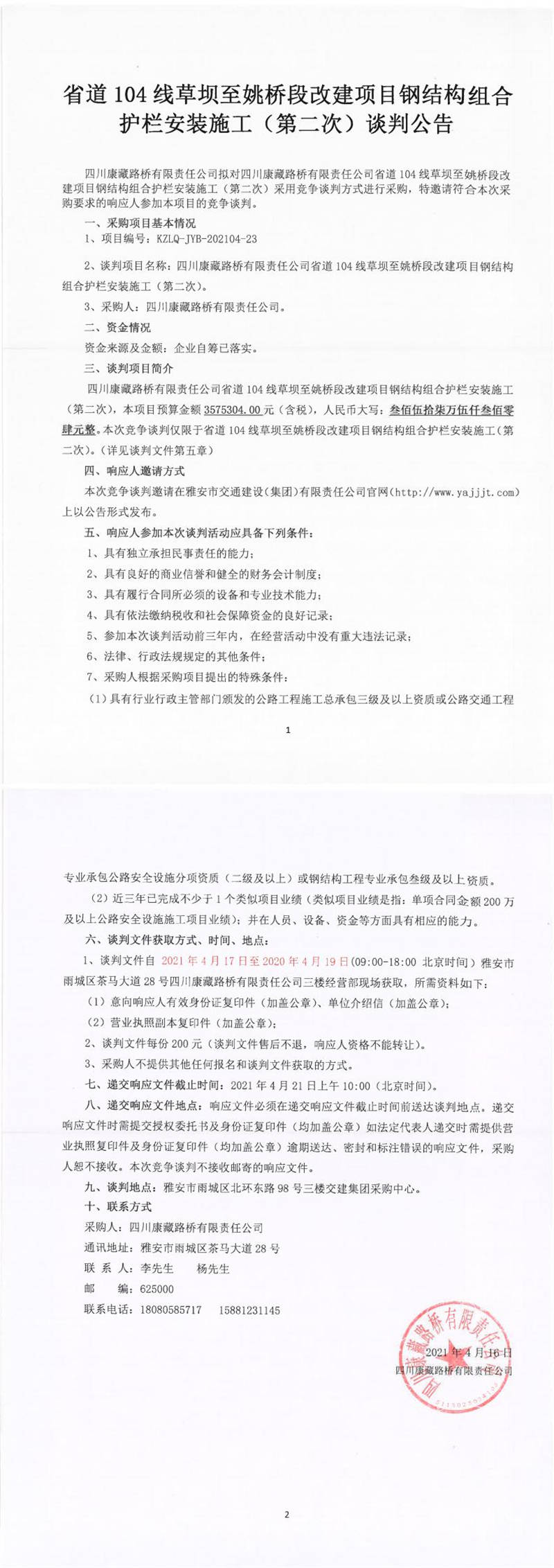 四川康藏路橋有限責任公司省道104線草壩至姚橋段改建項目鋼結構組合護欄安裝施工(第二次)談判公告