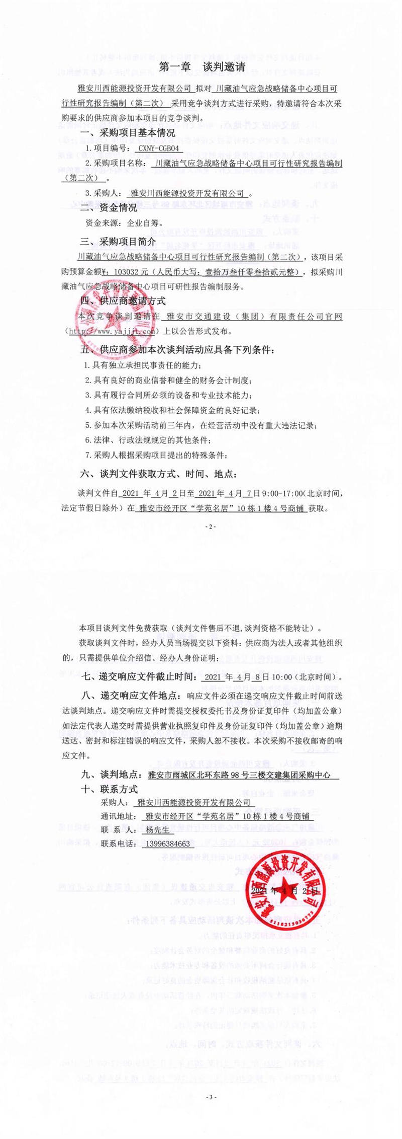 雅安川西能源投資開發(fā)有限公司川藏油氣應(yīng)急戰(zhàn)略儲(chǔ)備中心項(xiàng)目可行性研究報(bào)告編制(第二次)競爭談判公告