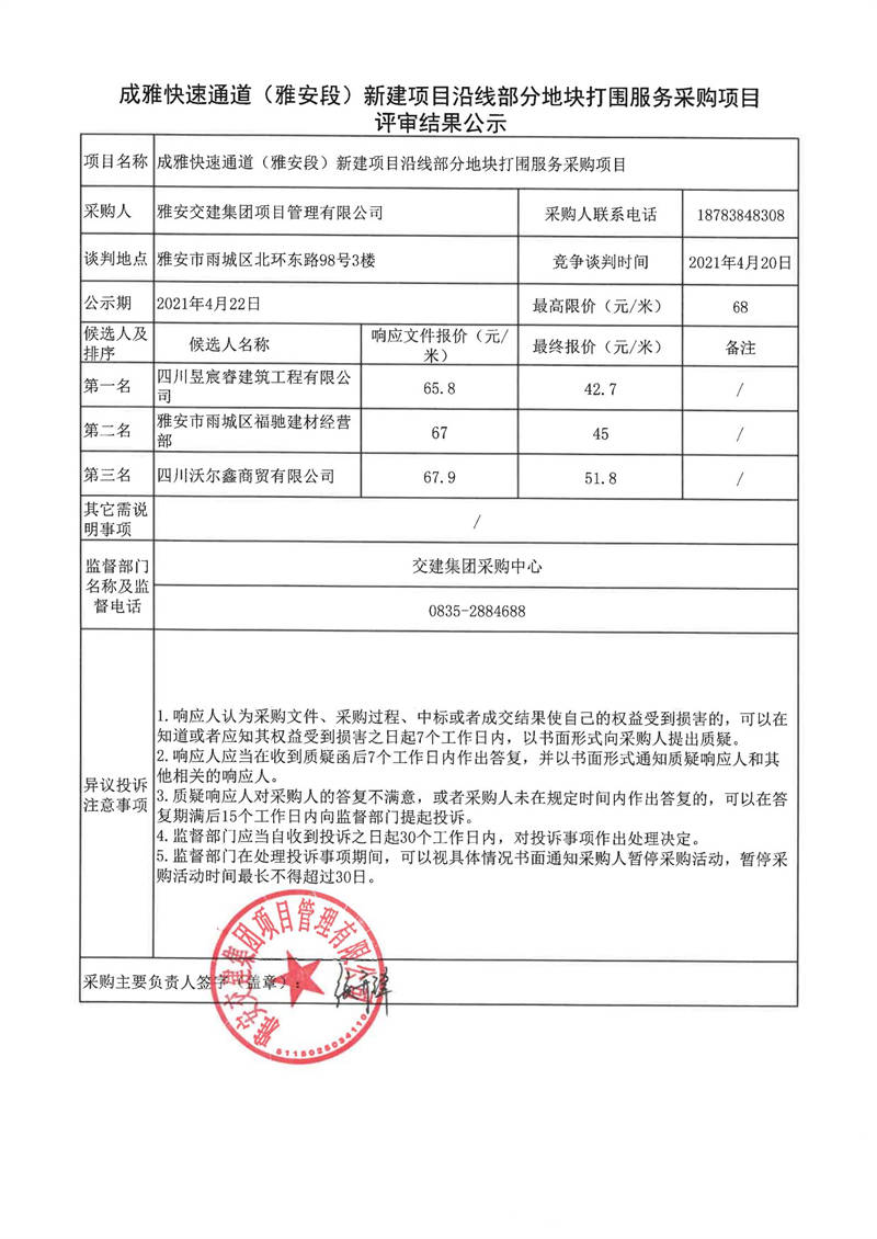 雅安交建集團(tuán)項目管理有限公司成雅快速通道(雅安段)新建項目沿線部分地塊打圍服務(wù)采購項目評審結(jié)果公示