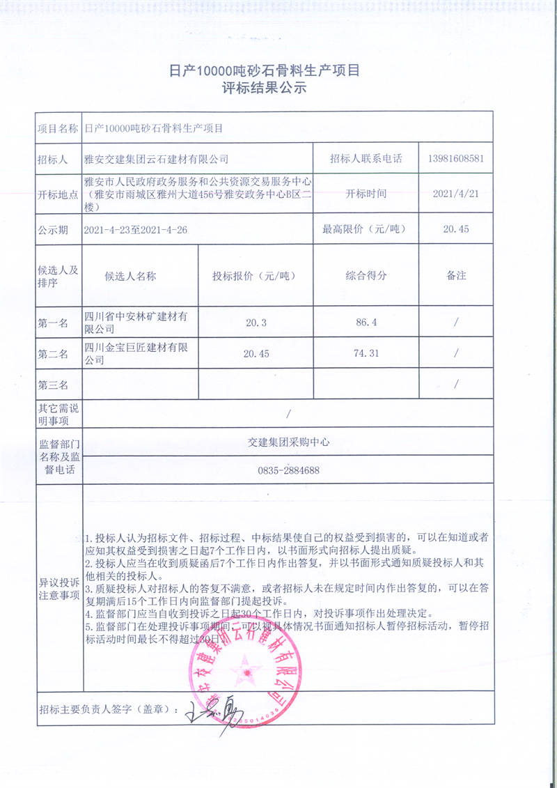 雅安交建集團云石建材有限公司日產(chǎn)10000噸砂石骨料生產(chǎn)項目評標結(jié)果公示