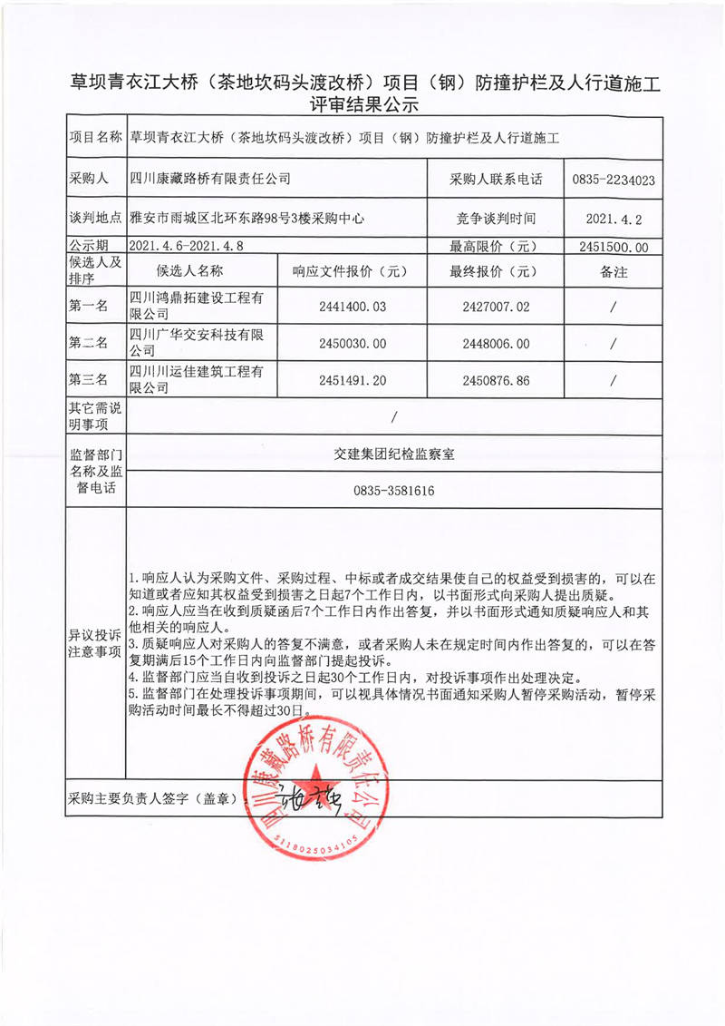 四川康藏路橋有限責(zé)任公司草壩青衣江大橋(茶地坎碼頭渡改橋)項(xiàng)目(鋼)防撞護(hù)欄及人行道施工評(píng)審結(jié)果公示