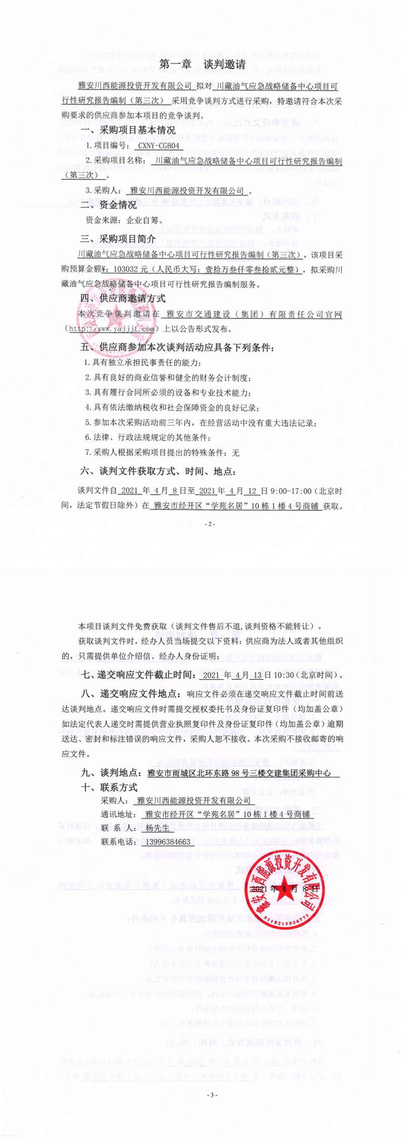 雅安川西能源投資開發(fā)有限公司川藏油氣應(yīng)急戰(zhàn)略儲(chǔ)備中心項(xiàng)目可行性研究報(bào)告編制(第三次)競(jìng)爭(zhēng)談判公告