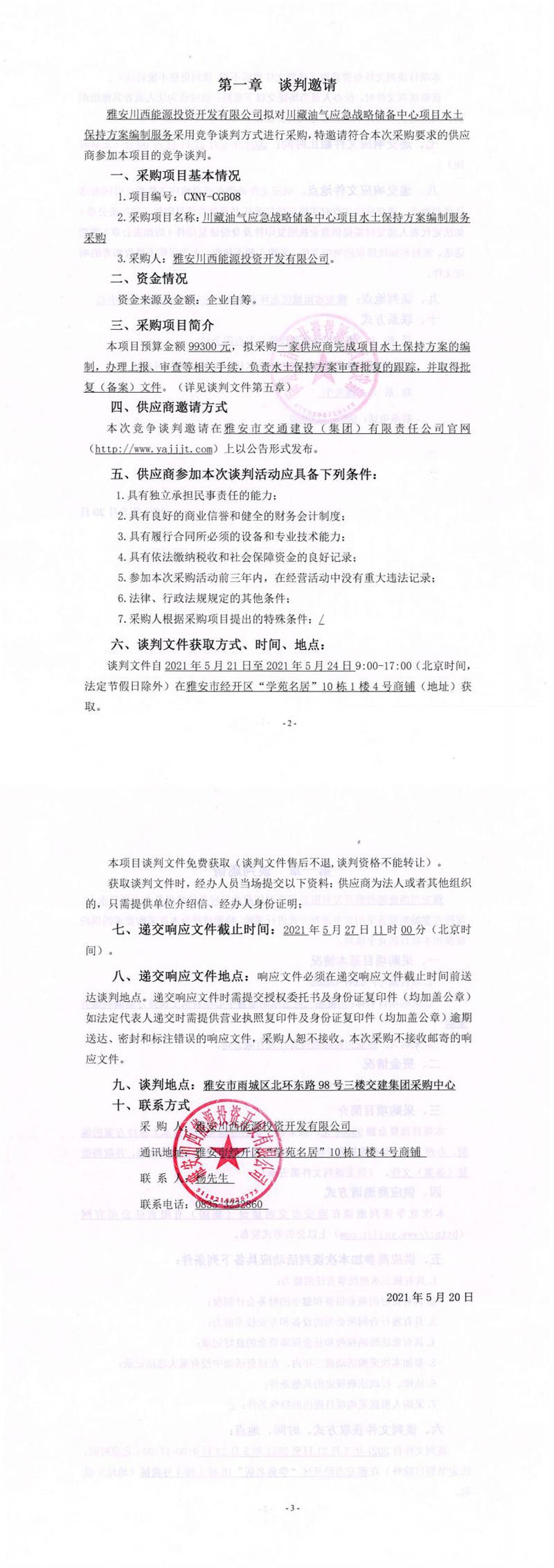 雅安川西能源投資開(kāi)發(fā)有限公司川藏油氣應(yīng)急戰(zhàn)略儲(chǔ)備中心項(xiàng)目水土保持方案編制服務(wù)采購(gòu)競(jìng)爭(zhēng)談判公告