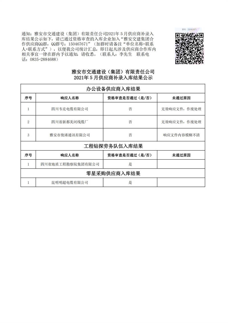 雅安市交通建設(shè)(集團(tuán))有限責(zé)任公司2021年5月供應(yīng)商補錄入庫結(jié)果公示