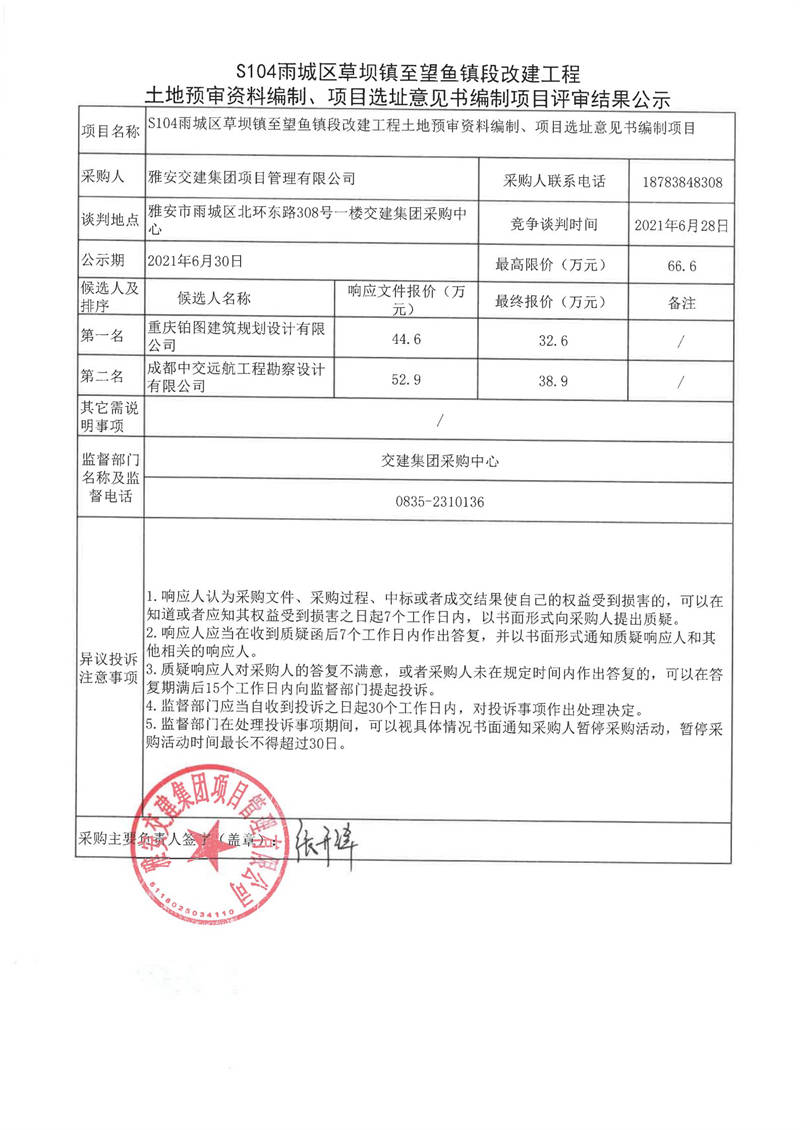 雅安交建集團(tuán)項(xiàng)目管理有限公司S104雨城區(qū)草壩鎮(zhèn)至望魚鎮(zhèn)段改建工程土地預(yù)審資料編制、項(xiàng)目選址意見書編制項(xiàng)目評審結(jié)果公示
