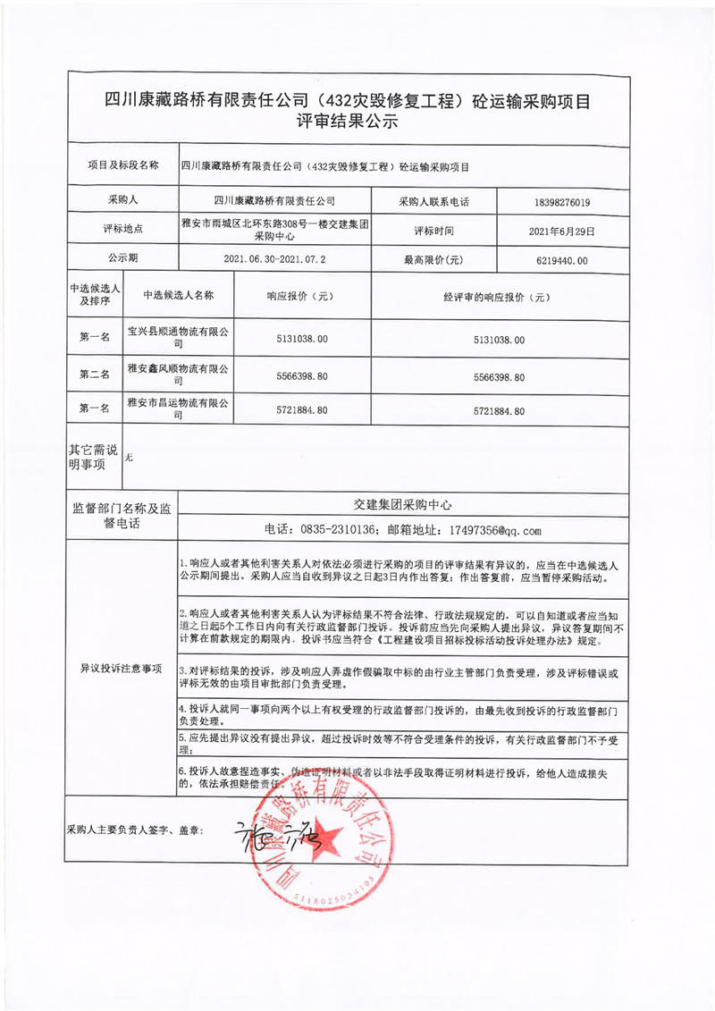 四川康藏路橋有限責(zé)任公司S432線(xiàn)寶興縣兩河口至甘孜界段災(zāi)毀修復(fù)整治工程砼運(yùn)輸采購(gòu)項(xiàng)目評(píng)審結(jié)果公示