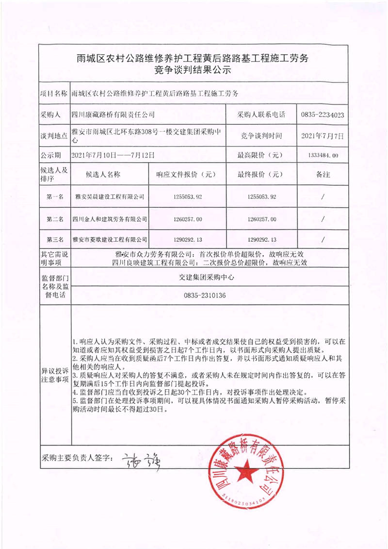 四川康藏路橋有限責(zé)任公司雨城區(qū)農(nóng)村公路維修養(yǎng)護(hù)工程黃后路路基工程施工勞務(wù)競(jìng)爭(zhēng)談判結(jié)果公示