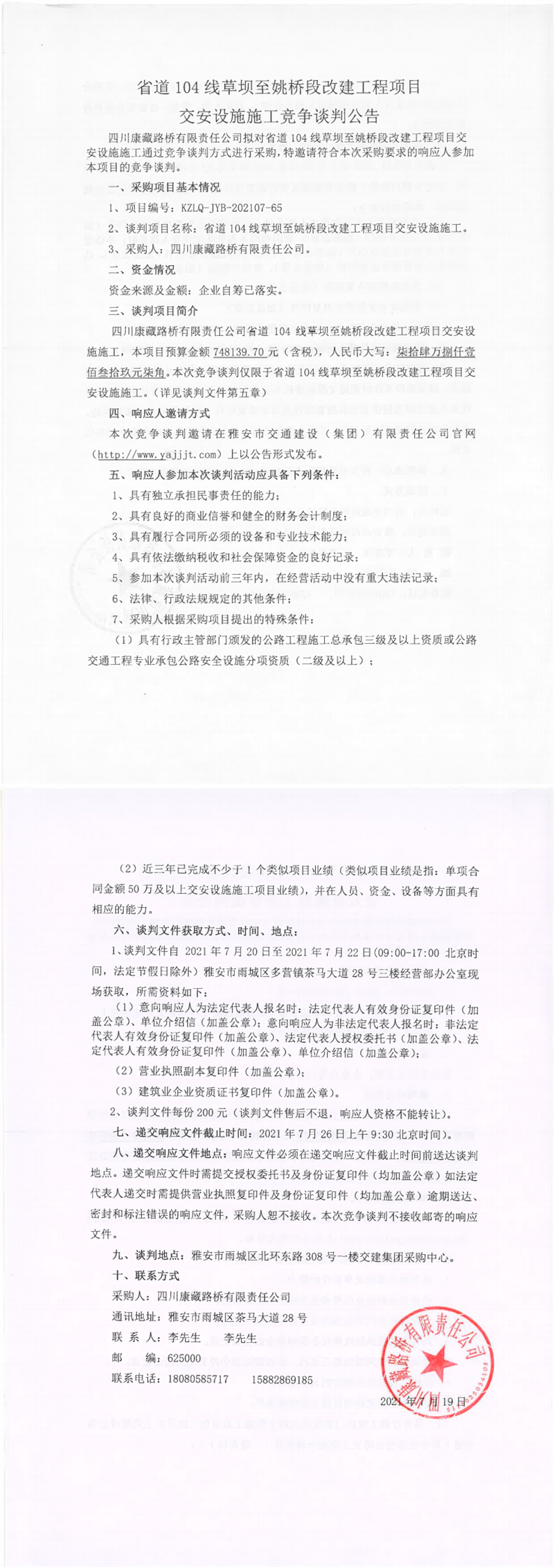 四川康藏路橋有限責任公司省道104線草壩至姚橋段改建項目交安設施施工競爭談判公告