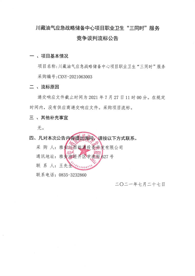 雅安川西能源投資開發(fā)有限公司川藏油氣應(yīng)急戰(zhàn)略儲(chǔ)備中心項(xiàng)目職業(yè)衛(wèi)生“三同時(shí)”服務(wù)競(jìng)爭(zhēng)談判流標(biāo)公告